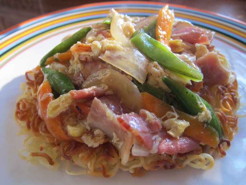 即席ラーメンを使ったあんかけかた焼きそば&お好み焼き粉を使った海鮮チヂミ☆★あとは昨日作っておいたポテトサラダを。
